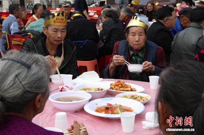图为老人们一起吃“坝坝宴”。成庆 摄